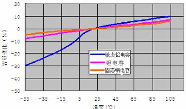 4)固態(tài)鋁電容器的溫度特性優(yōu)良,可以在較寬的溫度范圍內(nèi)保持容量的穩(wěn)定(見圖2),且ESR值幾乎不隨溫度發(fā)生改變(見圖3),因此,可以應(yīng)用于低溫或高溫環(huán)境中的設(shè)備;