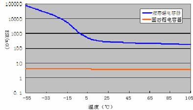 圖3 液態(tài)、固態(tài)鋁電容器的ESR-溫度變化曲線